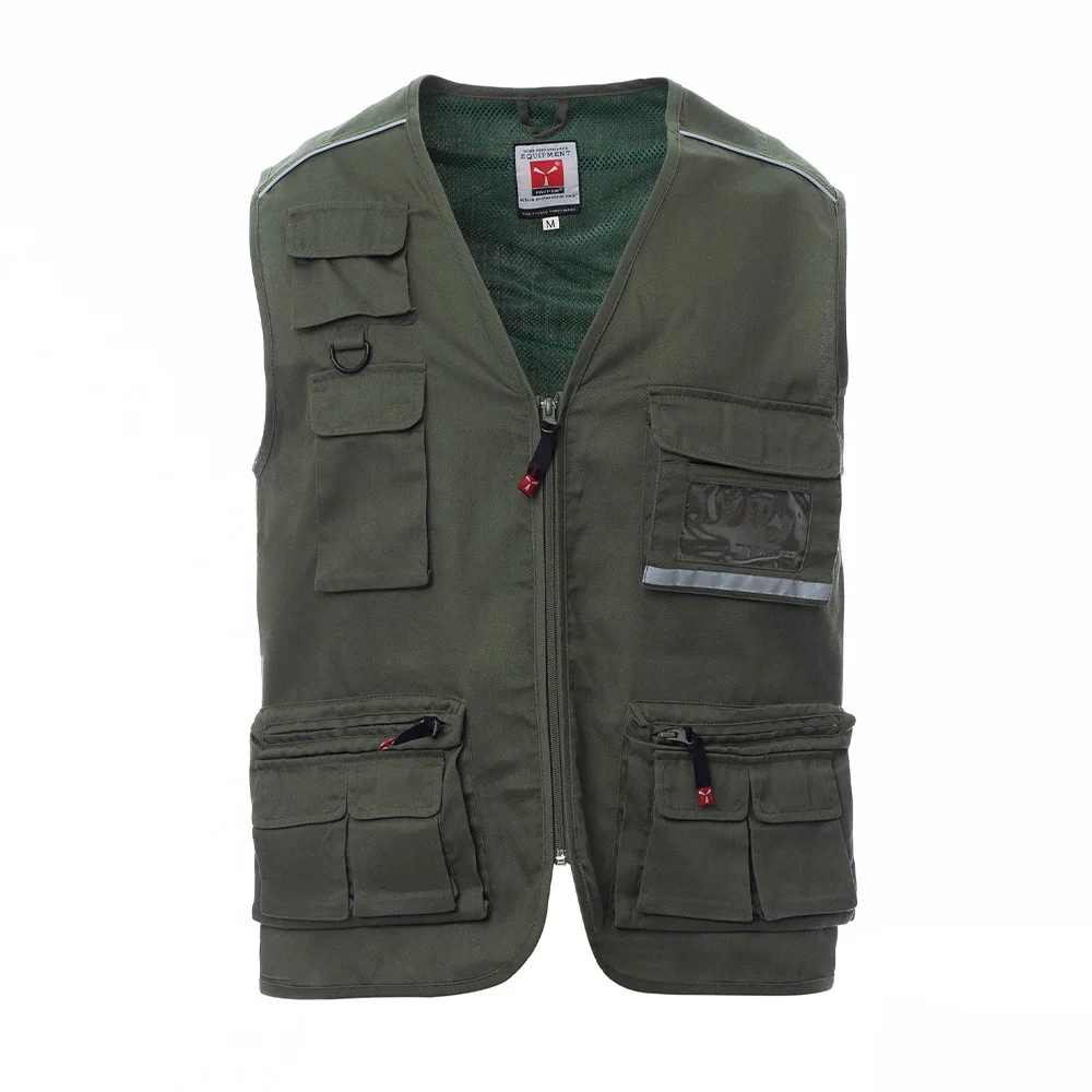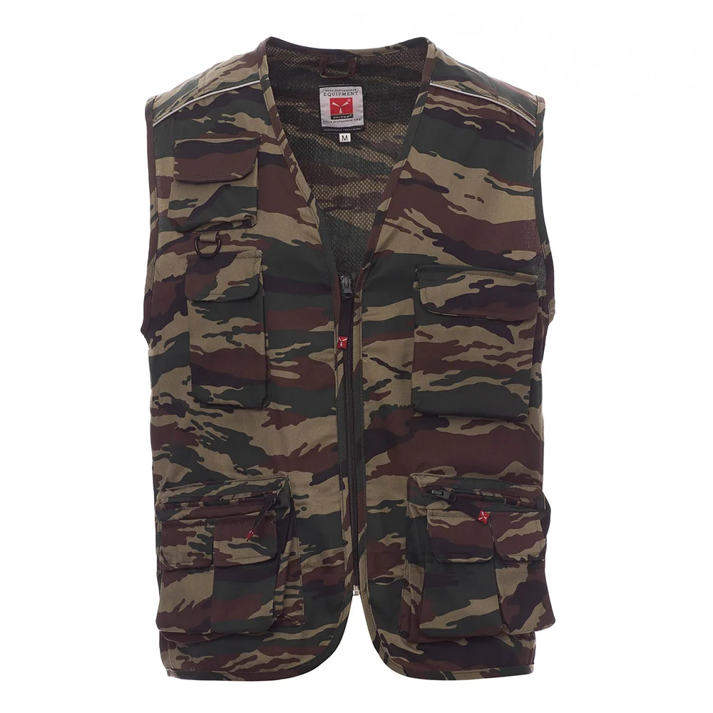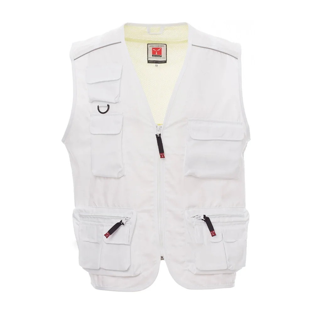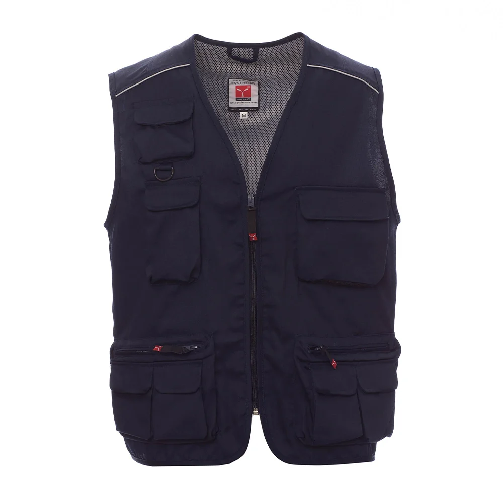 Gilet d’été, à fermeture éclair, composition multi-poches frontale avec un porte-badge réversible, passepoil réfléchissant sur les épaules et au dos, grande poche chasseur arrière, intérieur :