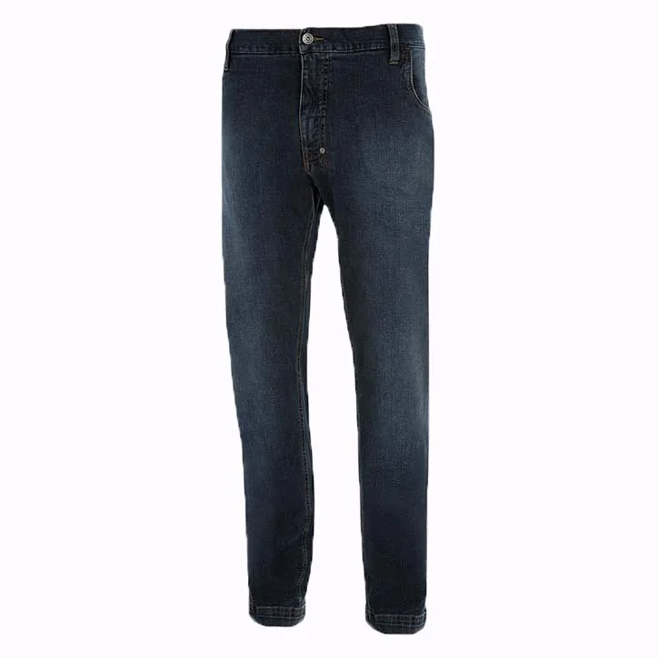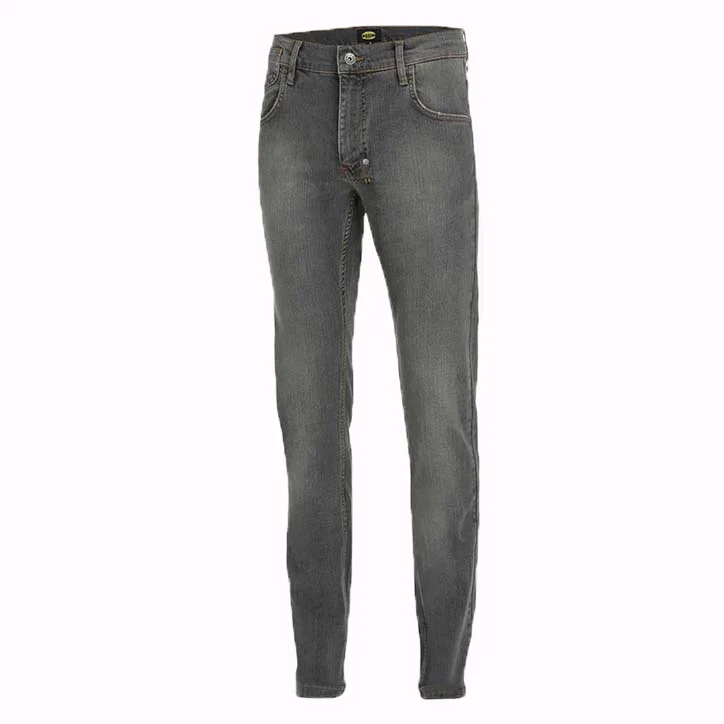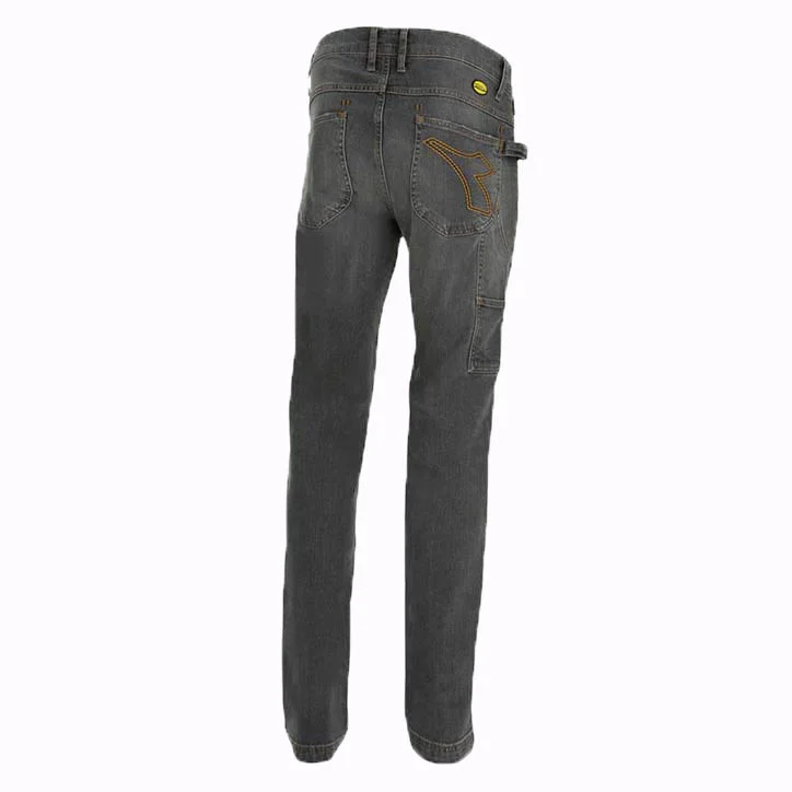 Jeans de travail Diadora en denim. Les traitements et le soin des détails sont typiques de la tradition italienne du travail du jean. Jeans stretch, porte-marteau, poche porte-mètre, lavage stone wash.