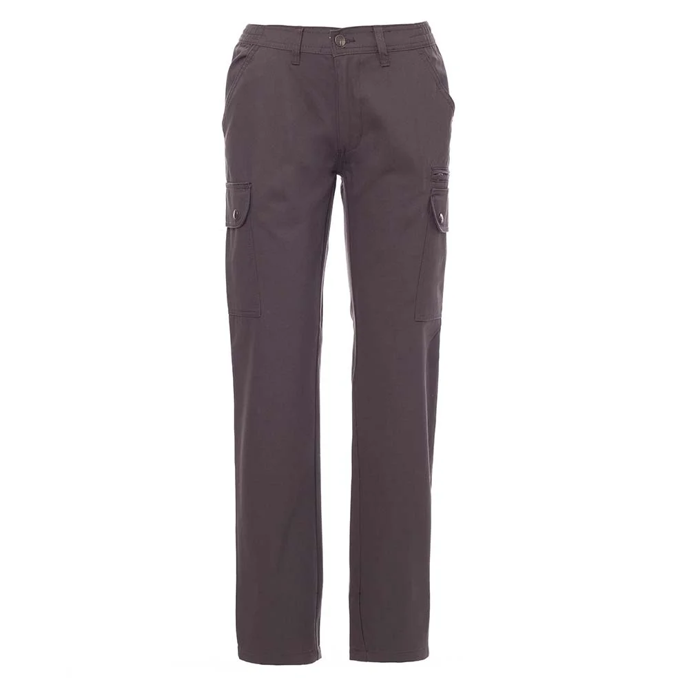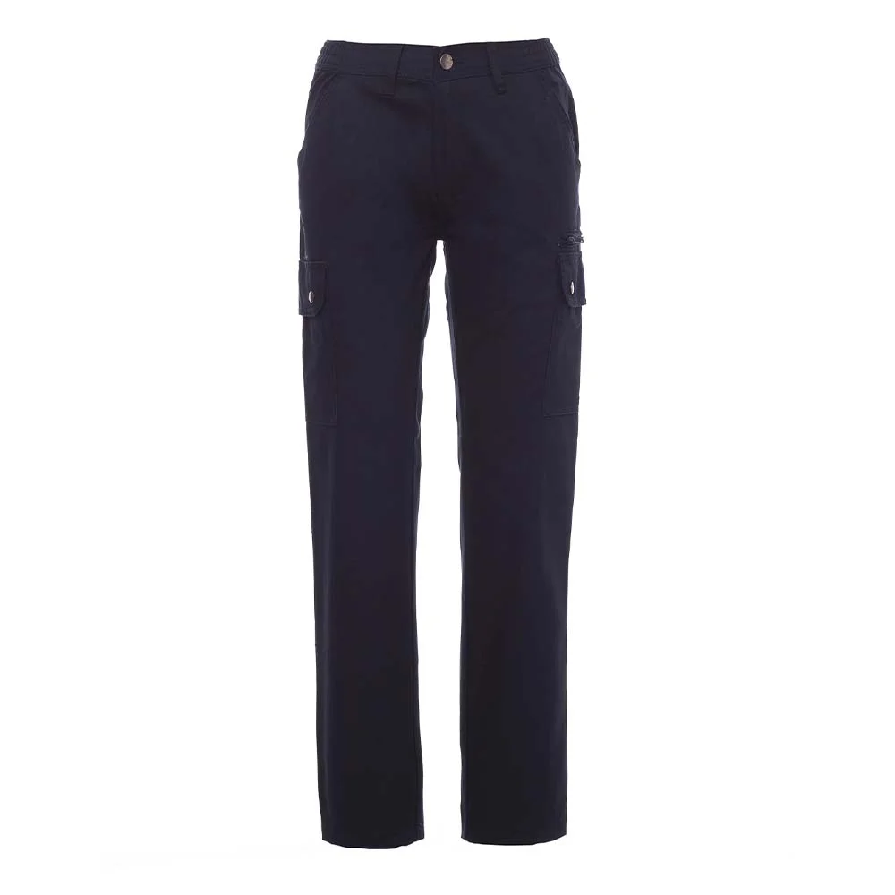 Pantalon multi-saison de coupe classique pour femme, avec élastiques latéraux et passants à la taille, fermeture par zip et bouton en métal, deux poches de coupe classique sur le devant, deux poches latérales avec rabat et boutons-pression, une poche avec zip côté gauche, un porte-mètre escamotable côté droit, deux poches arrière passepoilées avec boutonnière et bouton.