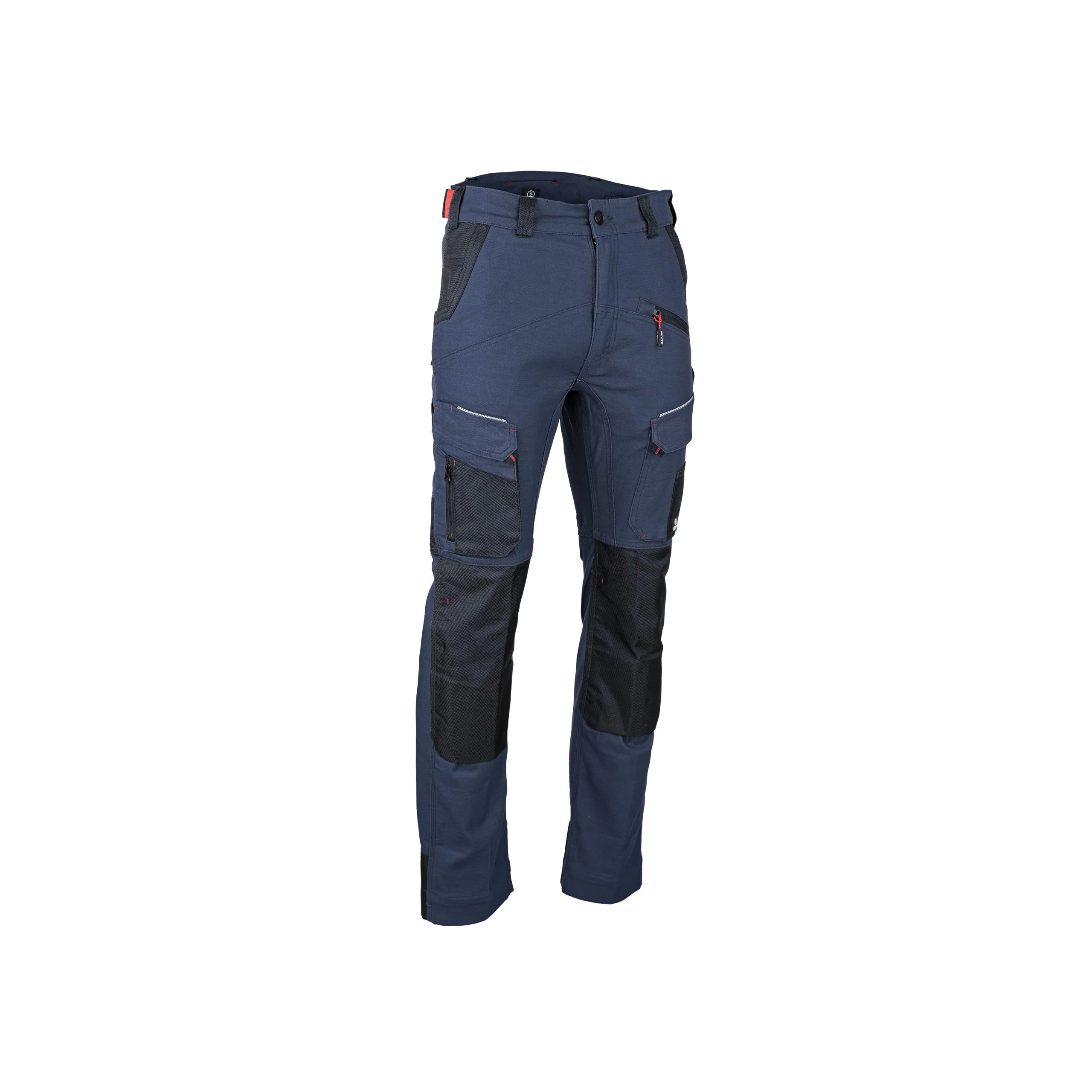 Ce pantalon de travail stretch bicolore est conçu pour offrir à la fois résistance, confort et fonctionnalité. Fabriqué en sergé 68 % coton, 30 % polyester et 2 % élasthanne (300 g/m²), il intègre des empiècements en Oxford 900D imperméable aux zones clés pour une durabilité renforcée. La ceinture est réhaussée dans le dos et ajustable sur les côtés par élastique contrastant, avec 4 passants classiques et un large au dos pour une meilleure tenue.