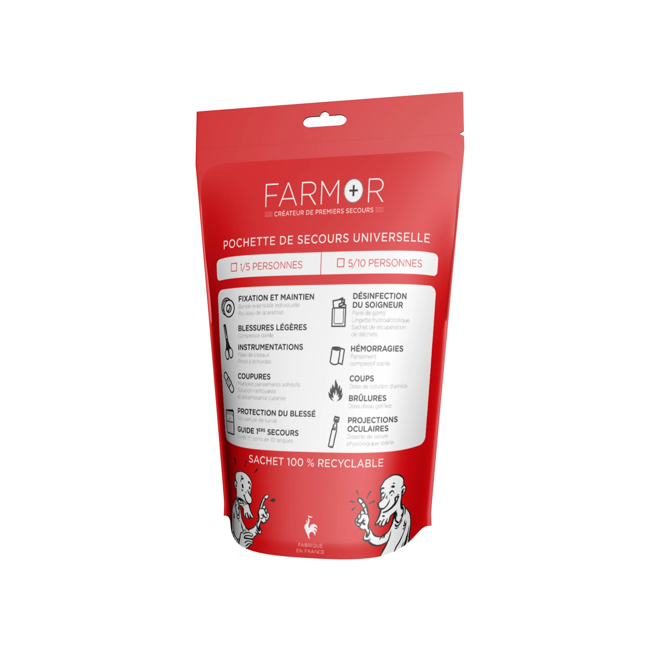 La pochette de secours FARMOR est conçue pour répondre aux besoins de premiers soins en contexte professionnel. Sa coque en PE durable et 100 % recyclable est refermable par zip, assurant une bonne protection contre la poussière et l’humidité et intègre un trou européen en vue d’un affichage mural pratique.