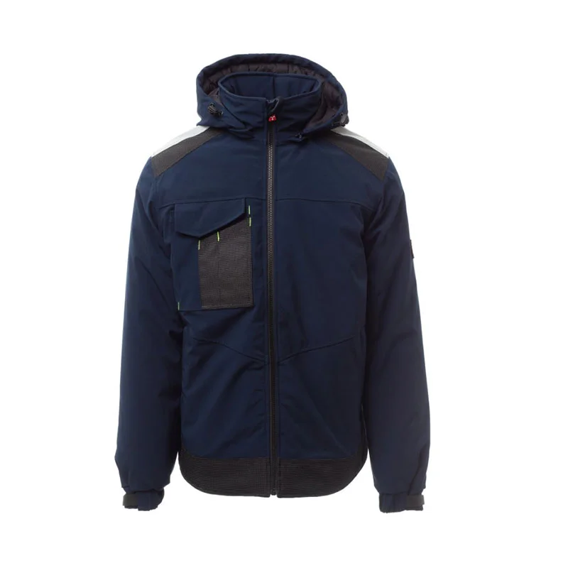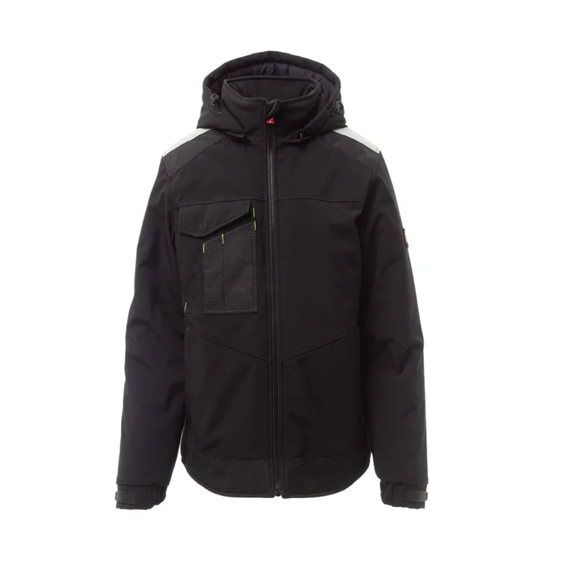 Soft-shell rembourré pour homme, fermeture par zip avec curseur en métal à verrouillage semi-automatique et tirette personnalisée. Capuche amovible, avec coulisse réglable. Bande rétroréfléchissante sur les épaules. Poignets élastiques, réglables par velcro. Poche poitrine Lock System avec rabat et porte-stylos. Deux poches latérales fermées par zip. Deux poches intérieures dont une avec porte-tablette fermée par velcro et une profilée avec zip sur poitrine côté droit. Bas réglable avec stoppeurs personnalisés et passepoil réfléchissant sur le dos.