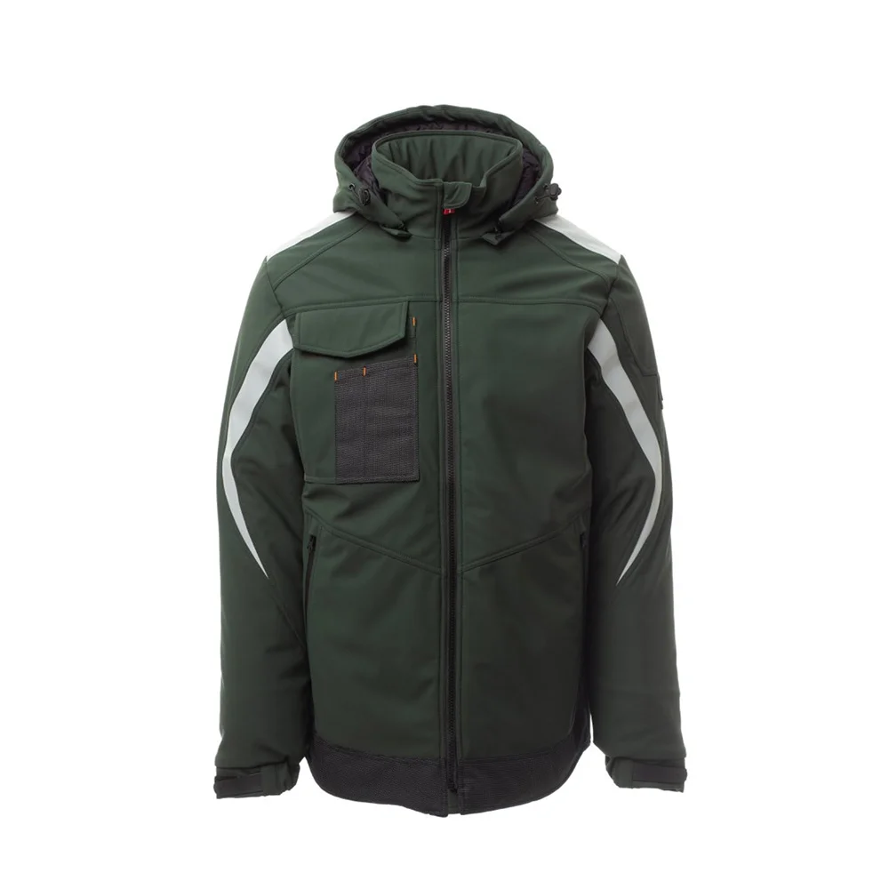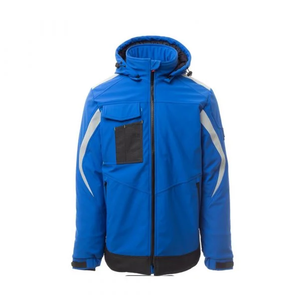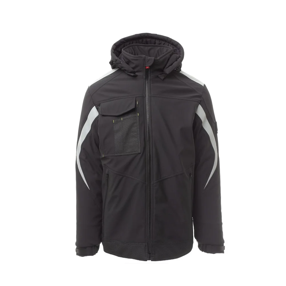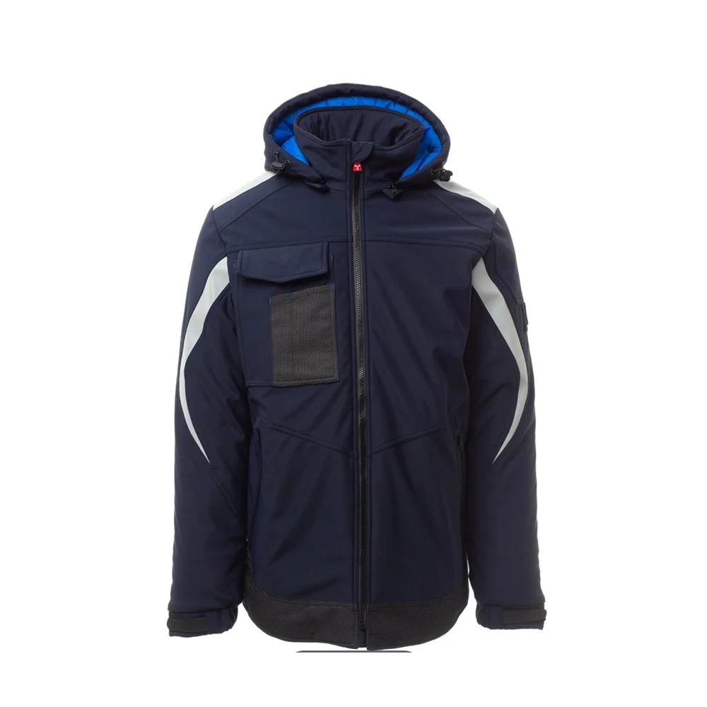 Soft-shell rembourré pour homme, fermeture par zip SBS avec curseur en métal à verrouillage semi-automatique et tirette personnalisée. Capuche amovible, avec coulisse réglable. Bande rétroréfléchissante sur les épaules et les bras. Poignets élastiques, réglables par velcro et poignet intérieur. Poche poitrine Lock System avec rabat, porte-badge et porte-stylos. Deux poches latérales fermées par zip avec ruban enduit. Élément « life-saving » au dos, avec logo interne rétroréfléchissant, fermé par zip enduit. Deux poches intérieures dont une avec porte-tablette fermée par velcro et une profilée avec zip sur poitrine côté droit. Bas réglable avec stoppeurs personnalisés. Tissu alvéolé avec effet rétroréfléchissant.