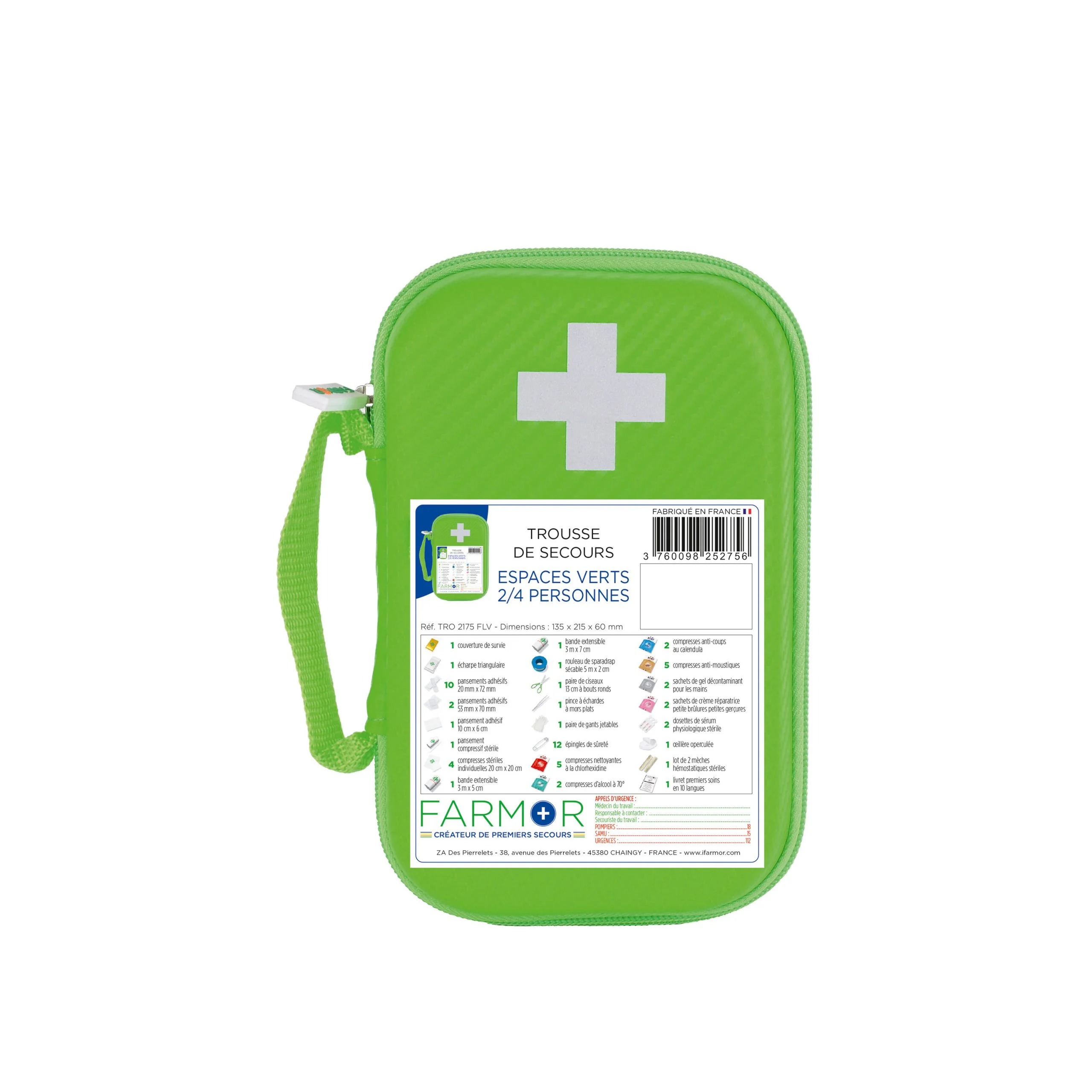 Elle inclut un contenu complet permettant de gérer les urgences courantes liées aux espaces verts : pansements, compresses, désinfectants, produits anti-moustiques, couverture de survie, instruments (ciseaux, pince à échardes), protections individuelles (gants, œillère), ainsi que des produits spécifiques comme des sachets de gel hydroalcoolique et crème réparatrice pour les petites brûlures ou gerçures. Un livret multilingue (10 langues) facilite l’utilisation, notamment en équipes internationales